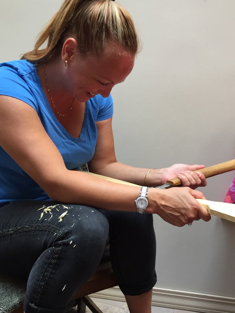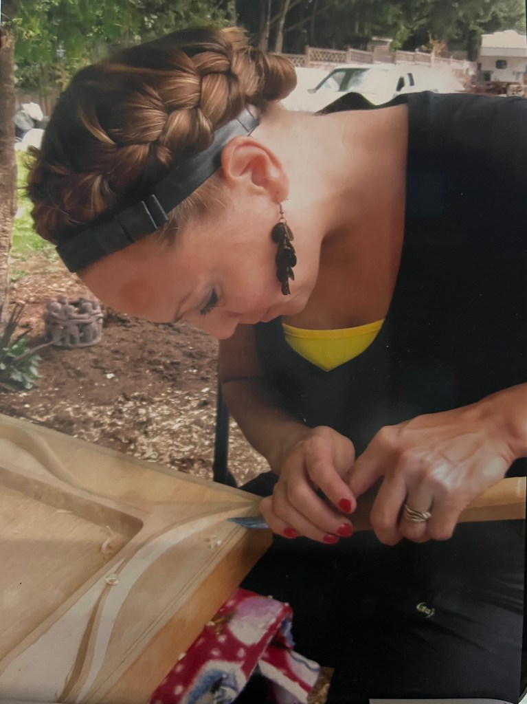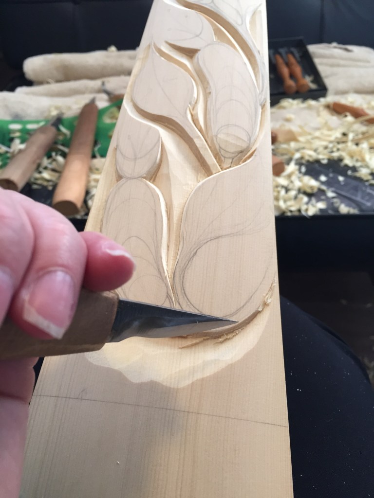 Here is a photo of me carving the edge of a yellow cedar panel that I carved in collaboration with my mom Jane Marston and sister Karen Marston. This panel had four salmon and water depicted on it.